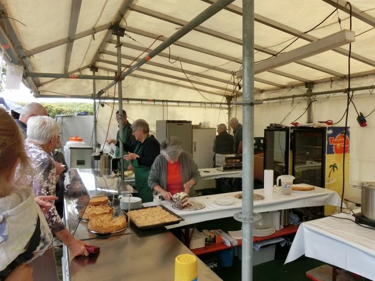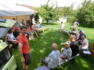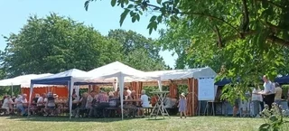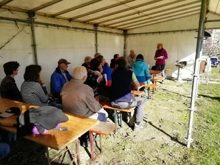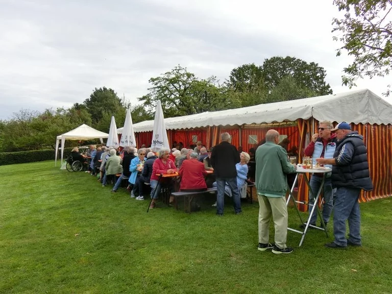 im Obstbaugarten bei Kaffee und Kuchen oder später bei Wurst