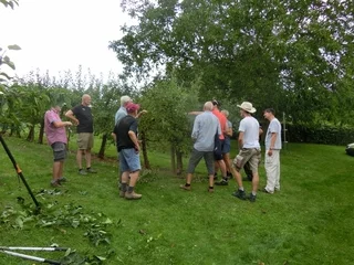 Knappe 30 Teilnehmer fanden sich - trotz brütender Hitze - im Obstbaugarten ein. Fachwart Martin Skokan klärte zuerst über sichere Arbeitsgeräte, sprich gute Leitern und gutes Werkzeug, sprich ordentliche Scheren und Sägen auf. Dann erklärte er warum ein Sommerschnitt genauso wichtig sei, wie ein Winterschnitt, er wies darauf hin, dass Süßkirsche und Nussbäume ausdrücklich nur einen Sommerschnitt wünschen. Nach Theorie folgte Praxis und da zeigte Martin Skokan an verschiedenen Spindelbäumen wie man es richtig macht, entweder wurde ausgeschnitten oder eingekürzt. Fragen waren ausdrücklich erwünscht und wurden auch immer sofort beantwortet. Und dann durfte wieder selbst Hand angelegt werden, nach der Devise "learning by doing".
