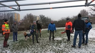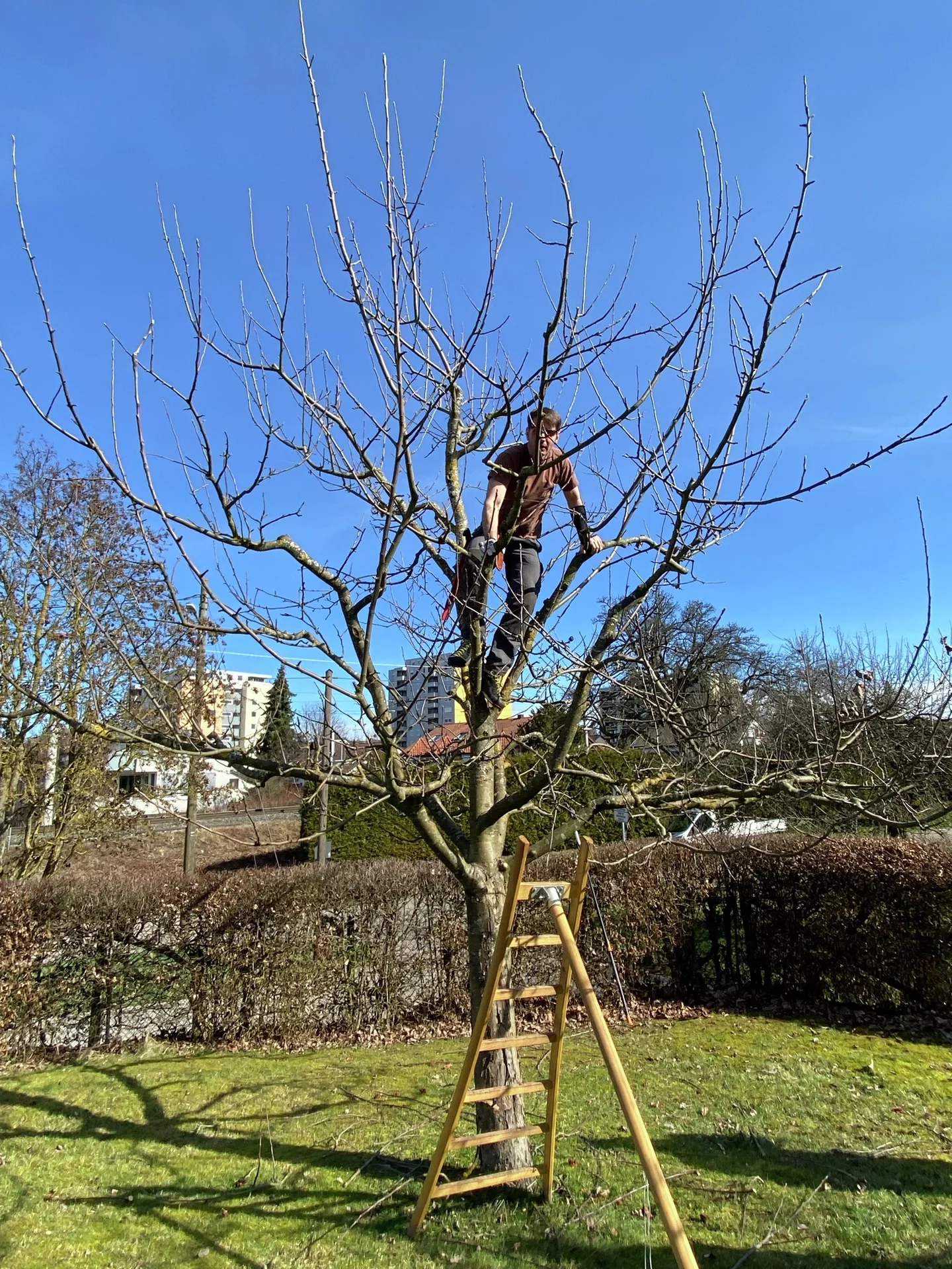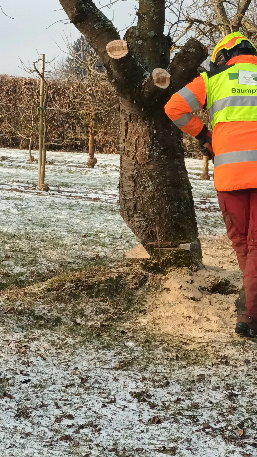 Zu einer ungewöhnlichen Aktion lud der Obstbauverein seine Mitglieder ein. Am 20. Januar 2024 war Treffpunkt im Obstbaugarten. Dick eingepackt – das Thermometer zeigte -7°, trafen sich wenige um beim fachgerechten Fällen von Obstbäumen dabei zu sein. Eine Süßkirsche und eine Sauerkirsche sowie einige Spalierbäume, die in der Reihe einfach viel zu eng standen, wurden gefällt, anschließend wurde das Schnittgut sofort gehäckselt.